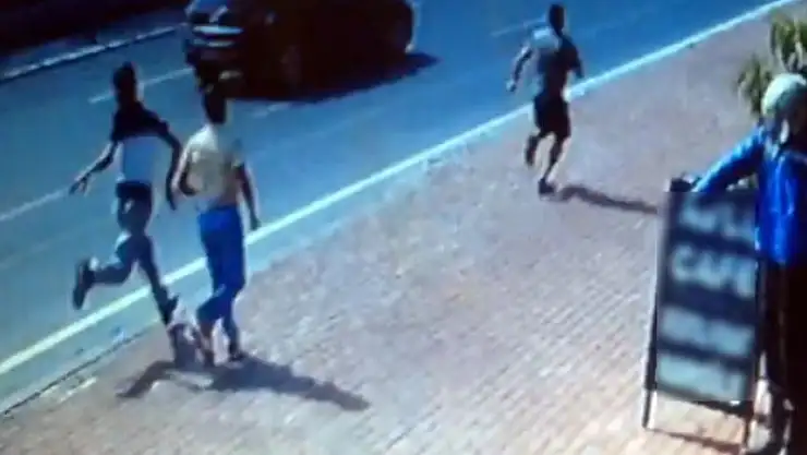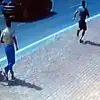 Güvenlik kameralarına yansıyan görüntülerde, çantayı çalan kapkaççılar kaldırım üzerinde koşuyor. Koşarken çantadaki cep telefonunu yere düşürüyor. Çantasını kaptıran turist kadın ise onların peşinden koşarak durmaları için elini kaldırıyor. Vatandaşlar kapkaççıların peşinden koşuyor. Motosikletli genç de kavşaktan dönerek şüphelilerin peşine takılıyor. Kaldırımda yürürken telefonu fark eden 2 zanlı ise etrafına bakındıktan sonra yere düşen cep telefonunu kaşla göz arasında alıyor. Telefonu alan zanlılar da koşarak uzaklaşıyor. Ardından genç kadına çantasını teslim ediyor. Bir yandan da polis ekiplerini arıyor. Cep telefonunun çantasında olmadığını fark eden kadın etrafı arıyor. Tam o esnada gencin yanına gelen kapkaççının arkadaşı ona tokat atarak saldırıyor.