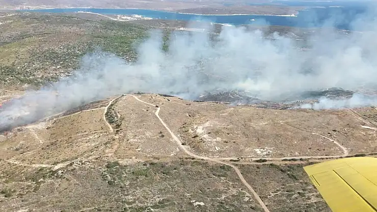 İzmir'in Çeşme ilçesinde, çöplükte çıkan ve otluk alana yayılan yangına müdahale ediliyor.