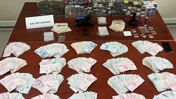Operasyonun devamında şüphelilerin ev ve iş yerlerine yapılan baskınlarda, 2 bin 736 adet captagon hap, 694 adet bandrolsüz sigara, bir adet ruhsatsız tabanca ve 10 fişek ile uyuşturucu ticaretinden elde edildiği değerlendirilen 207 bin 800 zira nakit para ele geçirildi.