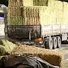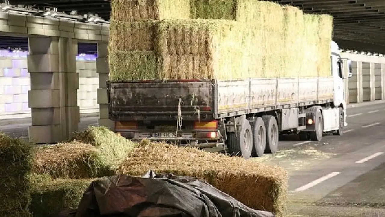 Alt geçide sıkışan tırın üstündeki saman balyalarının bir kısmı döküldü.