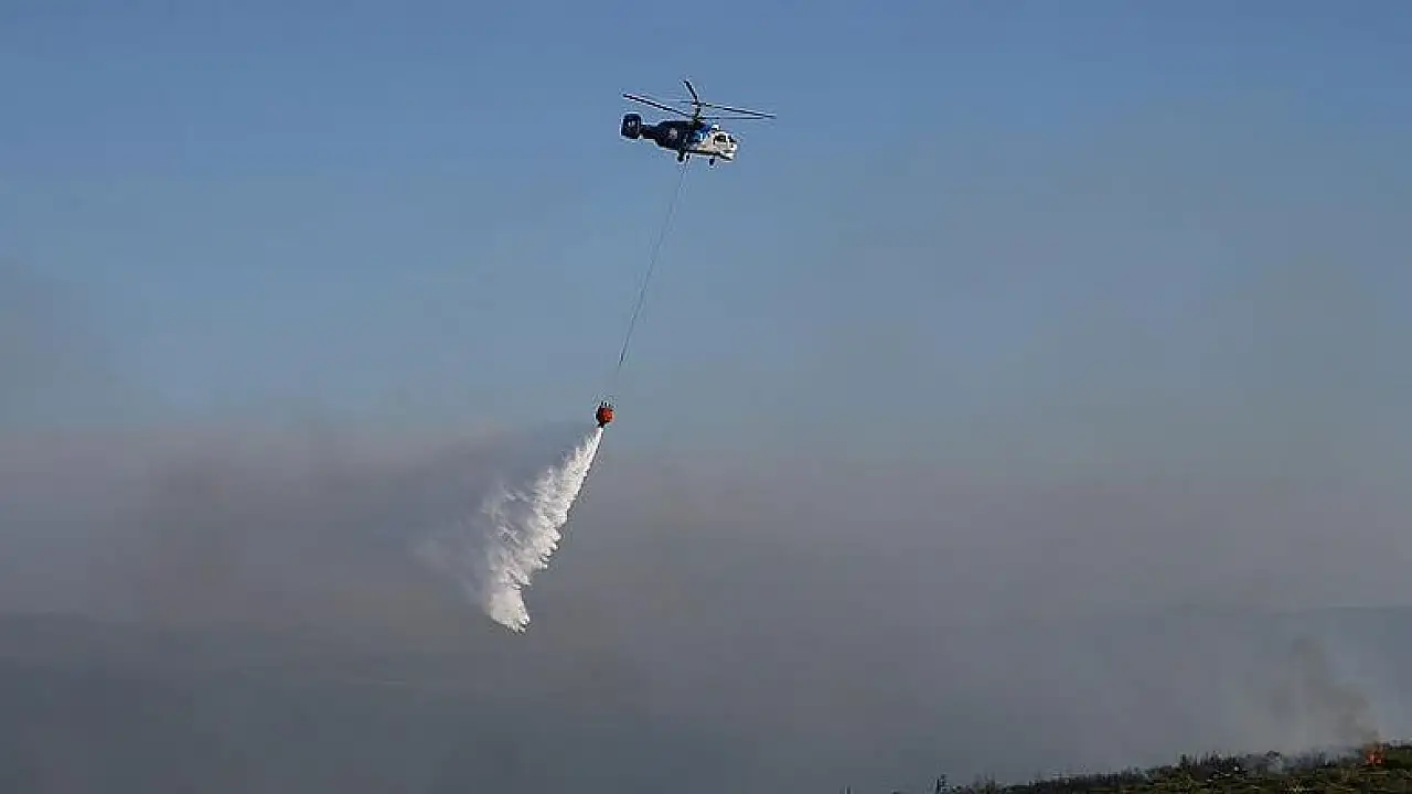 İzmir Gümüldür'deki orman yangınına müdahale etmek için Tahtalı Barajı'ndan su almaya çalışan ve 5 personeli bulunduğu bildirilen yangın söndürme helikopteri, baraj gölüne düştü.