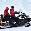 Yürümekte güçlük çektiği görülen köpek yavrusunun ayaklarında sorun olup olmadığını kontrol eden kadın jandarma personeli, kucağına alıp bir süre sevdiği köpeği kar motorunun üstünde karakola götürdü.