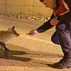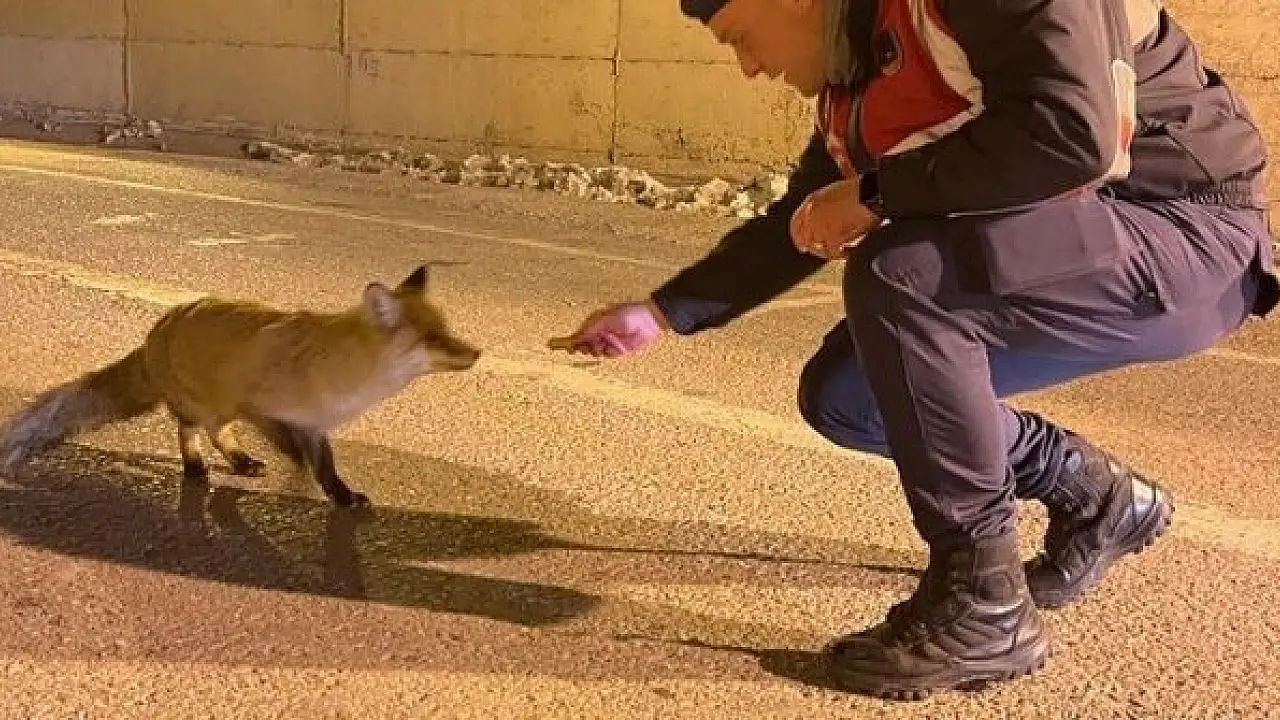 Jandarma aç kalan tilkiyi elleriyle besledi