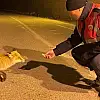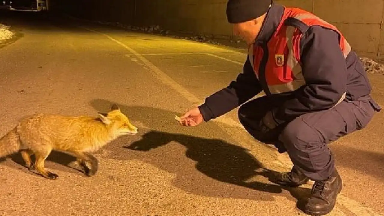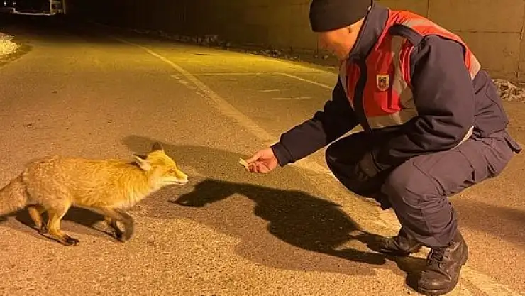 VAN'ın Başkale ilçesinde görev yapan jandarma trafik personeli, aç kaldığı sanılan tilkiyi yiyecek vererek besledi.