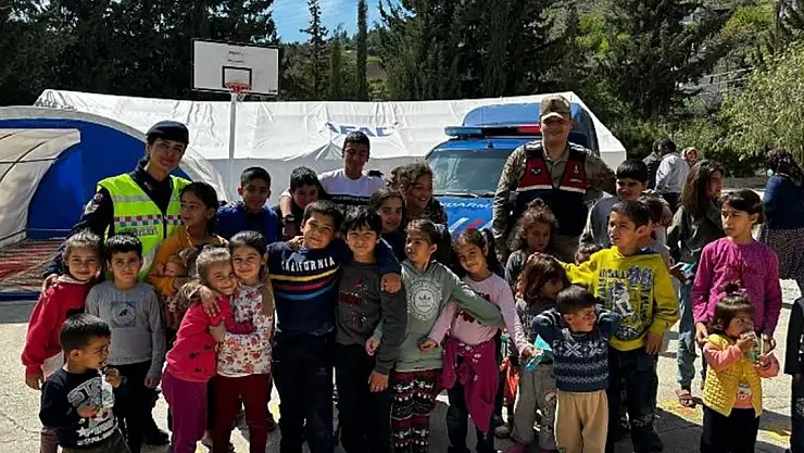 Hatay İl Jandarma Komutanlığı ekipleri, Antakya'daki depremzede çocuklara bayramlık ve oyuncak hediye etti.