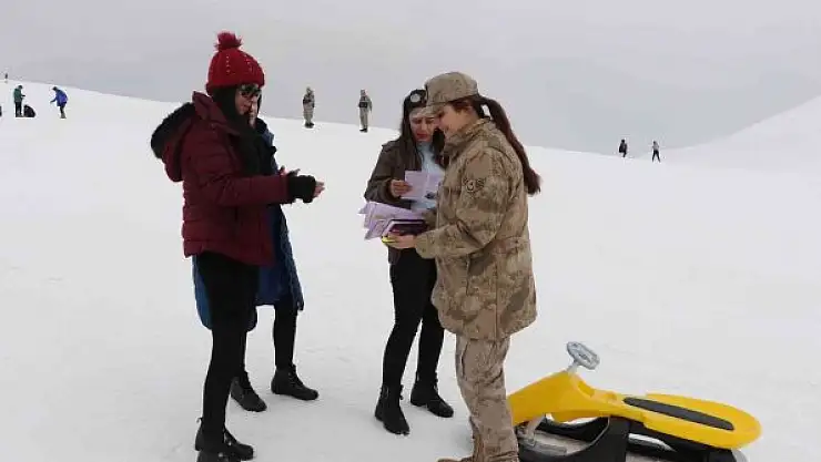 Bingöl'de Jandarma ekipleri, 2 bin 500 rakımlı Hesarek Kayak Merkezi'nde vatandaşlara KADES uygulamasını tanıttı.