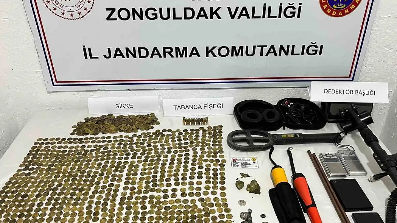 Jandarma ekiplerinin yaptığı operasyonda, adli makamlardan alınan arama kararı çerçevesinde A.K. ve E.K. isimli iki şüphelinin iş yeri, ikametgâh ve araçlarında arama yapıldı. Arama sonucunda bin 271 adet altın olduğu değerlendirilen sikke, 6 adet gümüş olduğu değerlendirilen sikke, 1 adet gümüş renkli heykel, 1 adet gümüş olduğu değerlendirilen kolye ucu, 1 adet gümüş olduğu değerlendirilen insan başlı aslan biblosu, 2 parça halinde değerli maden olabileceği değerlendirilen taş parçaları, 1 adet altın olduğu değerlendirilen taşlı yüzük, 12 adet 9X19 mm çapında tabanca fişeği, yılan kamera ve aparatları olduğu değerlendirilen cihaz, görüntü aktarma ekranı, 5 adet define arama dedektörü ve aparatları, 3 adet el dedektörü ve aparatları, 2 adet hassas terazi, 2 adet harici hard disk, 2 adet cep telefonu, 1 adet tablet bilgisayar ele geçirildi.