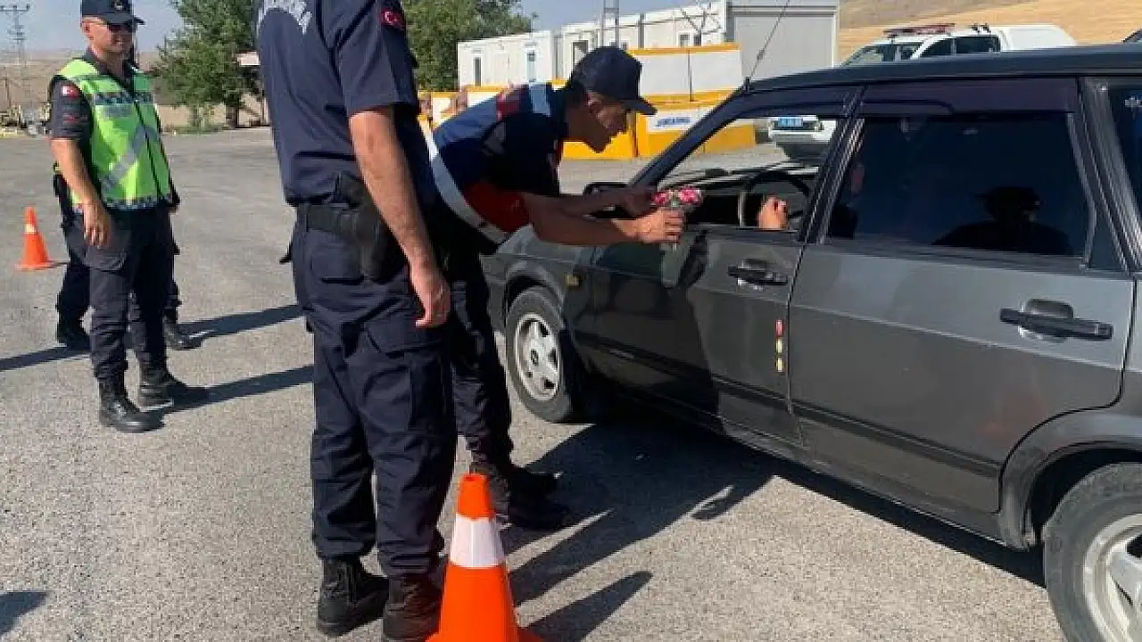 Malatya'nın Arguvan ilçesinde Jandarma Bölük Komutanı Ali Ayva ve jandarma ekipleri, trafik denetimi çerçevesinde durdurdukları sürücülerin Kurban Bayramı'nı kutlayarak, şeker ve kolonya ikram etti.