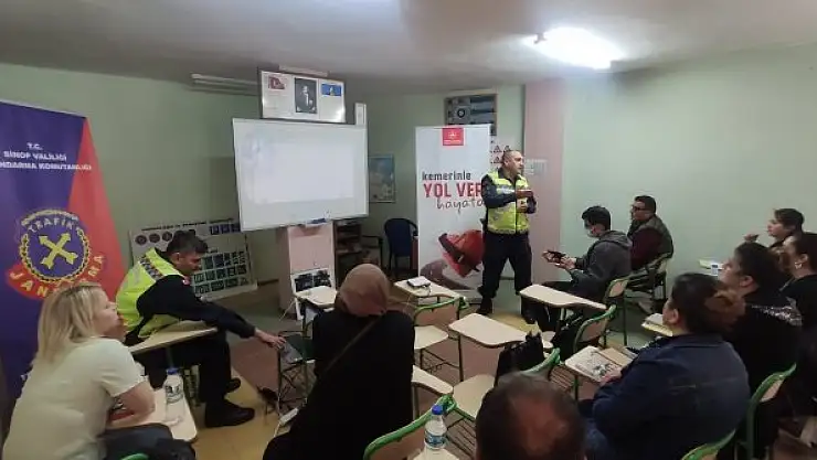 Karayolu Trafik Güvenliği Strateji Belgesi ve Eylem Planı dolayısıyla Sinop İl Jandarma Komutanlığı Trafik Şube Müdürlüğü'nce merkez ilçede 3, Boyabat'ta 1 olmak üzere toplam 4 sürücü kursunda adaylara trafik eğitimi verildi. Toplam 58 sürücü adayının katıldığı eğitimde güvenli trafik bilinci, genel trafik kuralları ve sürüş güvenliği konuları anlatıldı.