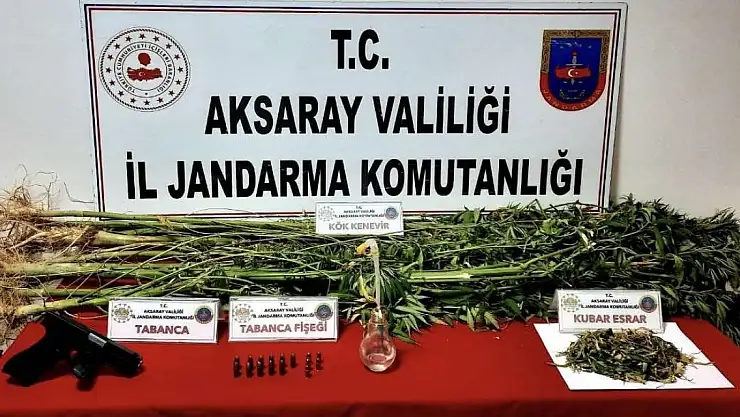 Aksaray'da İl Jandarma Komutanlığı tarafından 2 ayrı adrese düzenlenen operasyonda 50 kök kenevir bitkisi, kubar esrar ve tabanca ele geçirildi.