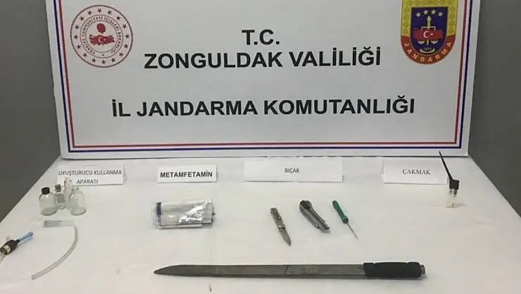 Edinilen bilgiye göre Zonguldak İl Jandarma Komutanlığı ekiplerince, Devrek ilçesinde bir araç ve araç içerisinde bulunan şüpheli üzerinde arama yapıldı. Aramada 11.44 gram Metamfetamin, 1 adet Uyuşturucu Kullanma Aparatı, 6 adet uyuşturucu madde kullanma aparatı, 2 adet Lyrıca uyuşturucu olduğu değerlendirilen hap, 1 adet pala, 1 adet çakı, 1 adet ucu sivriltilmiş tornavida, 1 adet maket bıçağı, 1 adet pürümüze çevrilmiş çakmak ele geçirildi.