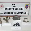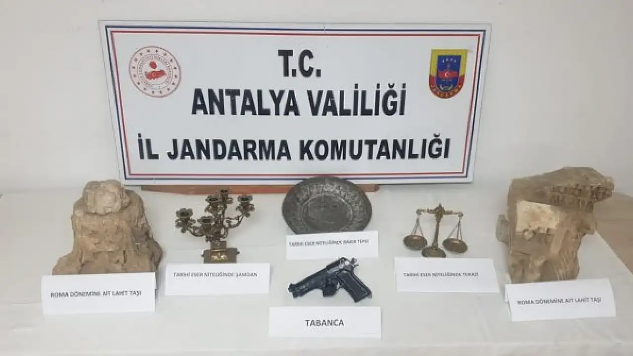 Antalya'da evinde tarihi eser bulunduğu ihbarı alınan şüphelinin ikametine yapılan baskında lahit taşı, bakır terazi, şamdan, bakır tepsi ve kurusıkı tabanca ele geçirildi.