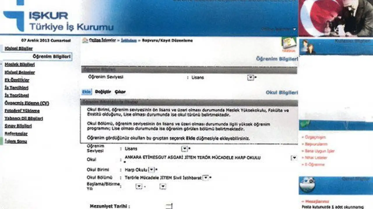 Hürriyet Gazetesinin haberine göre, Türkiye İş Kurumu’nun (İŞKUR) internet sitesindeki başvuru formunda “öğrenim gördüğünüz okullar” listesinde, “Ankara Etimesgut Asgari JİTEM Terörle Mücadele Harp Okulu” seçeneği dikkat çekiyor. İş bulmak amacıyla İŞKUR’da online başvuru formu doldurmak isteyenler, üye kaydı yaparak şifre oluşturuyor. Şifreyle İŞKUR’un sitesine girenler, online işlemler bölümünde form dolduruyor.