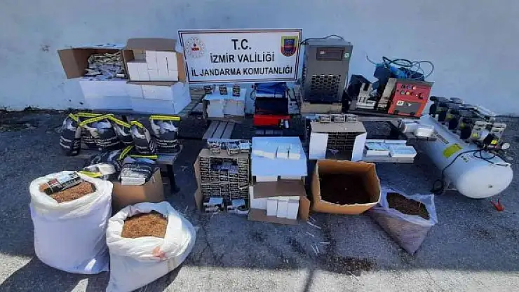 Belirlenen adrese operasyon düzenleyen İzmir İl Jandarma Komutanlığı KOM Şube Müdürlüğü ve Aliağa İlçe Jandarma Komutanlığı ekipleri, yaptıkları aramada 53 bin 600 adet bandrolsüz boş makaron, 27 bin 400 adet markalı bandrolleri sökülmüş boş makaron, 5 bin adet naylon sigara paketleme ambalajı, 3 bin 820 adet satışa hazır vaziyette içi doldurulmuş makaron, 80 kilogram kıyılmış açık tütün, 2 adet sigara doldurma makinası, 3 adet hesap kayıt defteri, 1 adet basınç ayar cihazı, 1 adet kompresör, 15 adet TAPDK bandrolü ele geçirdi.