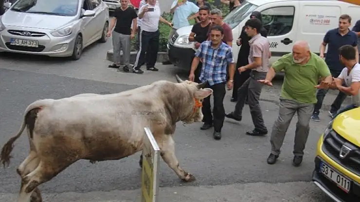 Rize şehir merkezinde aynı kamyonetin kasasında bulunan iki boğa, indirilmek istendikleri sırada sahiplerinin elinden kurtulup şehrin en işlek caddesi olan Atatürk Caddesi’ne girdi. İş yerlerine giren, caddelerde koşan boğalar, bayram alışverişine çıkan vatandaşlara korku dolu anlar yaşattı. Boğalardan biri kısa sürede yakalanırken, diğeri ise sahiplerini bir hayli uğraştırdı. Bir türlü yakalanamayan boğa, Rize Belediyesi ekipleri tarafından iğne ile uyutularak yakalandı.