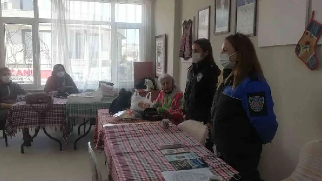 Burhaniye İlçe Emniyet Müdürlüğünde görevli Komiser Yardımcısı Esra Başol ve Polis Memuru Türkan Yamiç, Halk Eğitimi Merkezi kurslarına katılan kadınları ziyaret etmeye devam ediyor. Dün de İskele Mahallesindeki El Sanatları Kursuna giden kadın polisler, kurs öğretmeni Aliye Çolak ve kursiyer kadınlarla toplantı yaptı. Kadınlara broşürler dağıtan Esra Başol ve Türkan Yamiç, iletişim yoluyla dolandırıcılık, genel asayiş kuralları, güvenli internet kullanımı, Kades ve hırsızlık konularında bilgiler verdi. Esra Başol ve Türkan Yamiç'e teşekkür eden Kurs Öğretmeni Aliye çolak, " Bizleri bilgilendirdiler, çok faydalı bilgiler edindik. Kendilerine teşekkür ediyoruz" dedi.