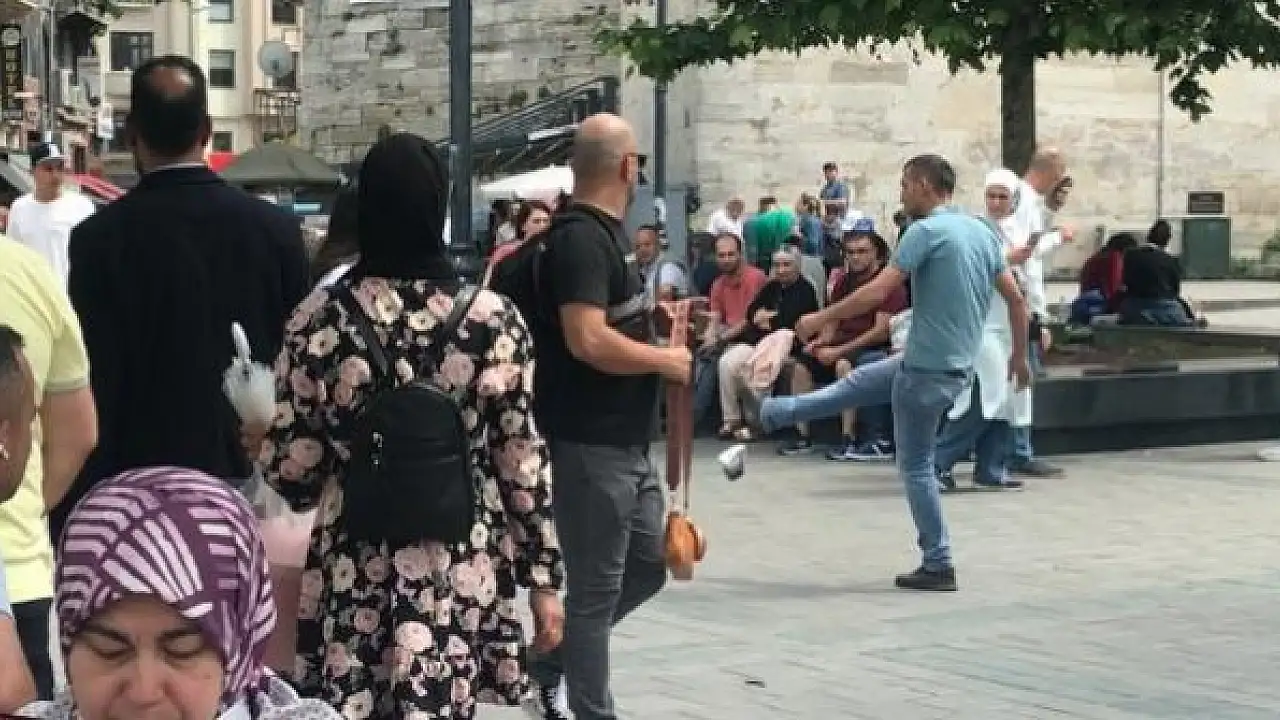 EMİNÖNÜ'nde, çorap satın almak isterken tartıştığı seyyar satıcı kadını darbedip ürünlerini tekmeleyen kişiye çevredekiler tepki gösterdi. Durumu uzaktan gören bir kişi, kadına yardım ettikten sonra saldırgana kafa attı. Tüm yaşananlar kameraya yansıdı.