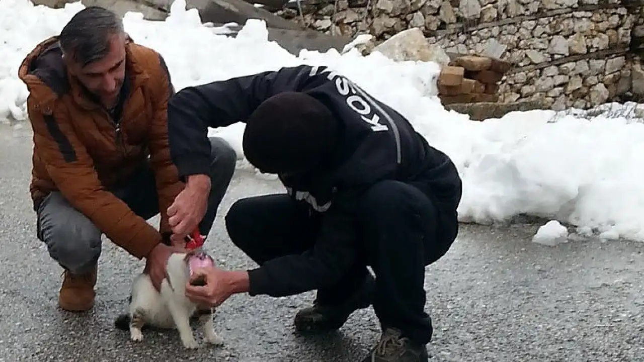 Konya'nın Derebucak ilçesinde kafası konserve kutusuna sıkışan kedi kurtarıldı.