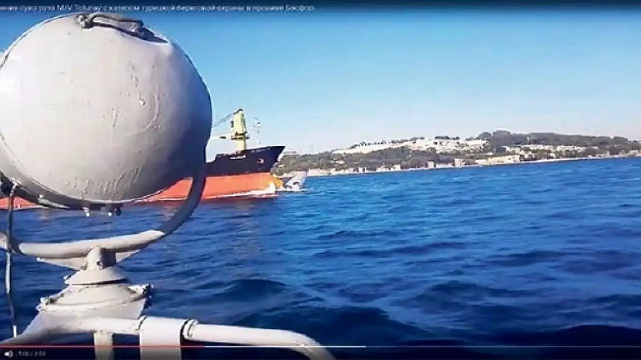 Rus savaş gemisi Caesar Kunikov'a refakat ederken yük gemisiyle çarpışıp alabora olan Sahil Güvenlik Komutanlığı botunun batış anına ilişkin yeni görüntüleri ortaya çıktı.