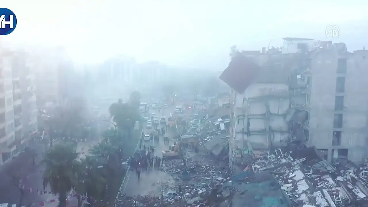 Merkez üssü Kahramanmaraş'ın Pazarcık ve Elbistan ilçeleri olan 7,7 ve 7,6 büyüklüğündeki depremlerin ardından Hayrullah Mahallesinde çöken binalar havadan görüntülendi.