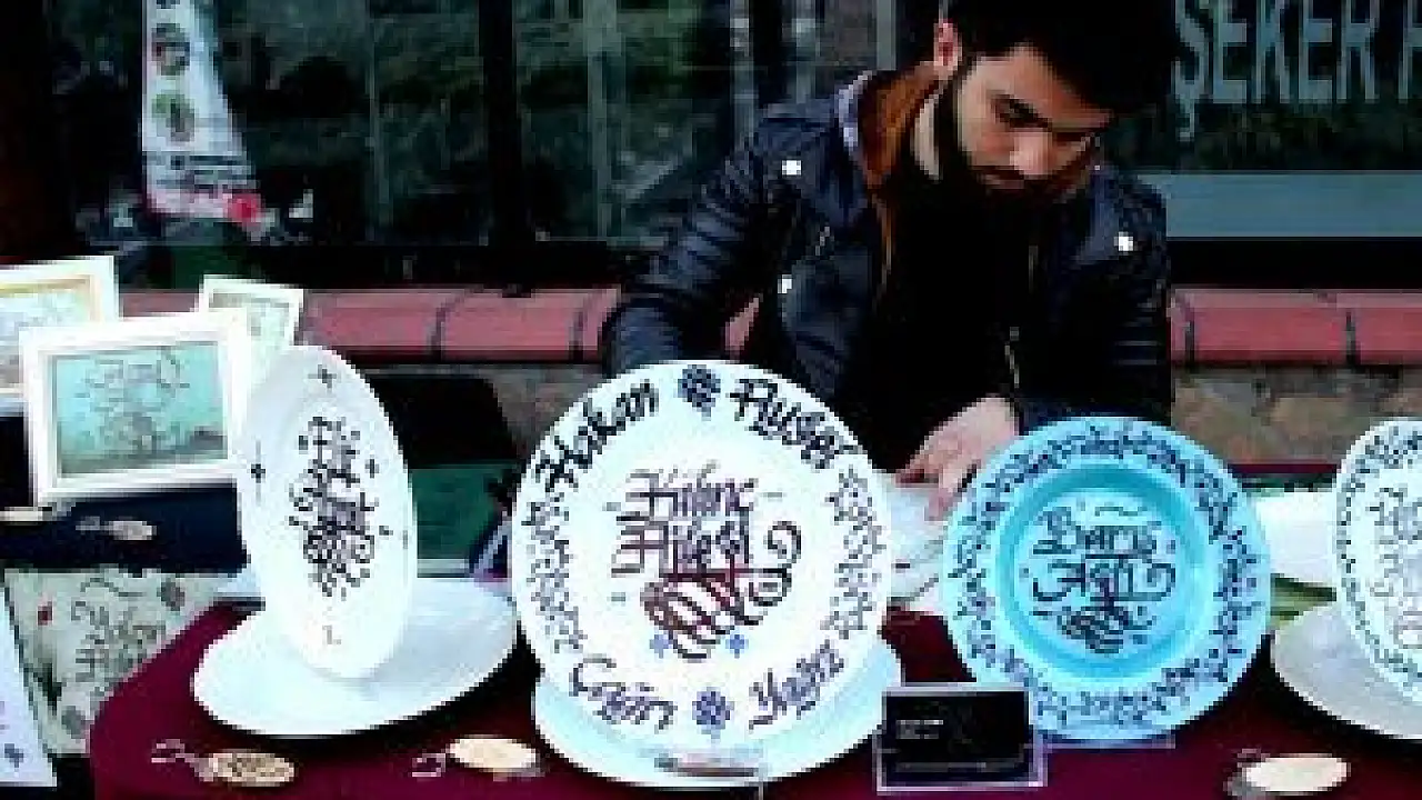 Ahmet Üney, AA muhabirine Atatürk Caddesi'ndeki standında yaptığı açıklamada, 3 yıldır kaligrafi sanatıyla uğraştığını, kazandığı parayı eğitimine harcayacağını söyledi.