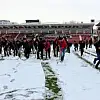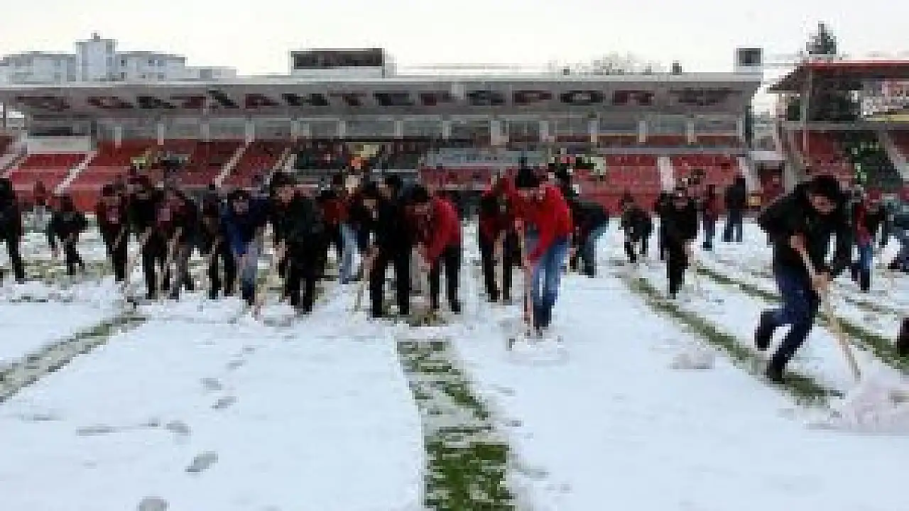 Gaziantepspor - Bursaspor maçı öncesinde yoğun kar yağışı nedeniyle yüzlerce taraftar sahaya inerek, kar temizleme çalışmalarına yardım etti.