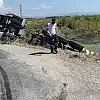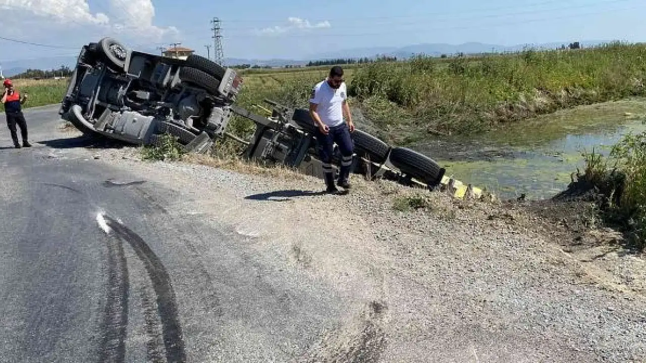 Aydın'ın Söke ilçesi Gölbent Mahallesi yolunda meydana gelen kazada, bir maden şirketine ait olduğu öğrenilen kamyon sulama kanalına devrildi.