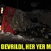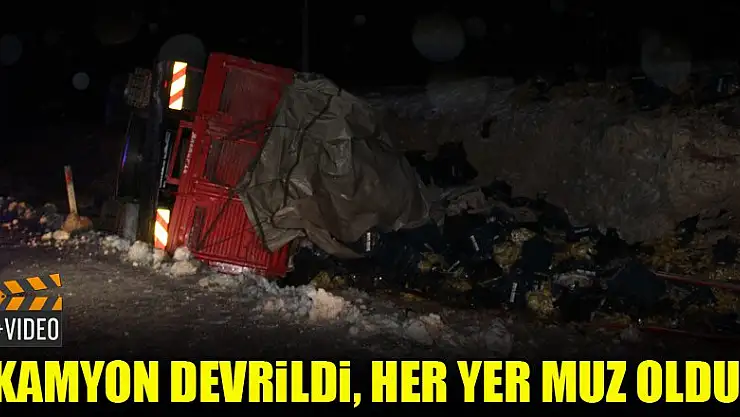 Karaman'da muz yüklü kamyonun devrilmesi sonucu sürücüsü yaralanırken, kasasında bulunan muzlar etrafa saçıldı.