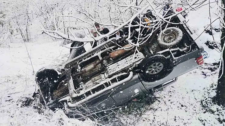 Ordu'nun Ünye ilçesinde etkili olan kar yağışından dolayı kontrolden çıkan kamyonet fındık bahçesine yuvarlanırken, kazada sürücü ve yanında bulunan eşi yaralandı.