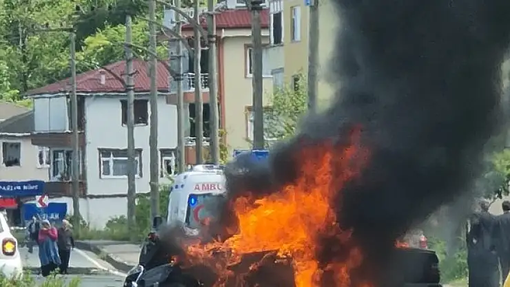 Trabzon'un Sürmene ilçesinde, kamyonetle çarpışan otomobil, alev aldı. Sürücüler hafif yaralanırken, otomobil ise kullanılamaz hale geldi.
