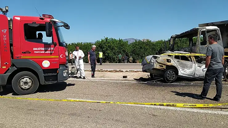 Adana'nın Kozan ilçesinde sabah saatlerinde iş yerinin önünden çalınan otomobil, kamyonla çarpıştıktan sonra alev aldı. Yangında, otomobilin sürücüsü yaşamını yitirdi.