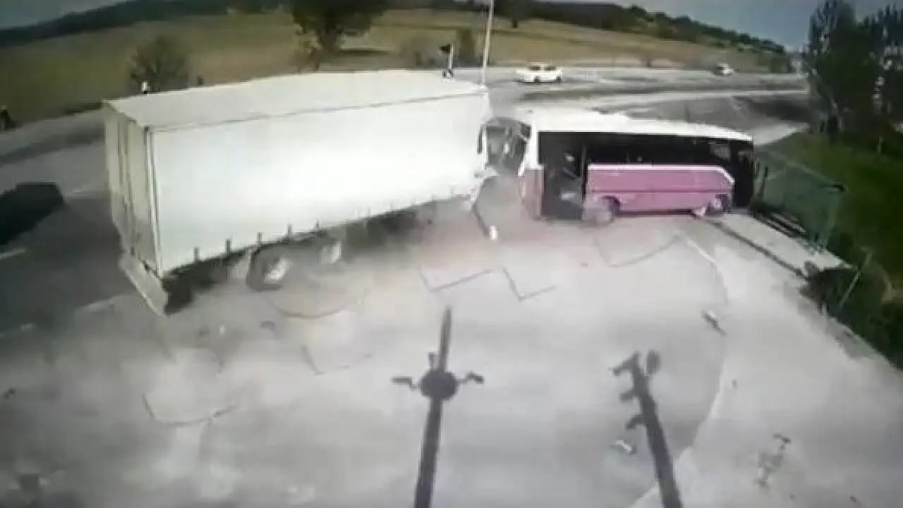 Kamyonun yolcu otobüsüne çarptığı feci kaza kamerada