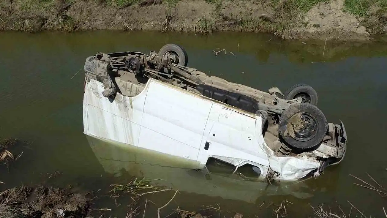Antalya'nın Manavgat ilçesinde su kanalına uçan kamyonetin sürücüsü ve yanındaki arkadaşı, ters dönen araçtan kendi imkanlarıyla burunları kanamadan çıktı.