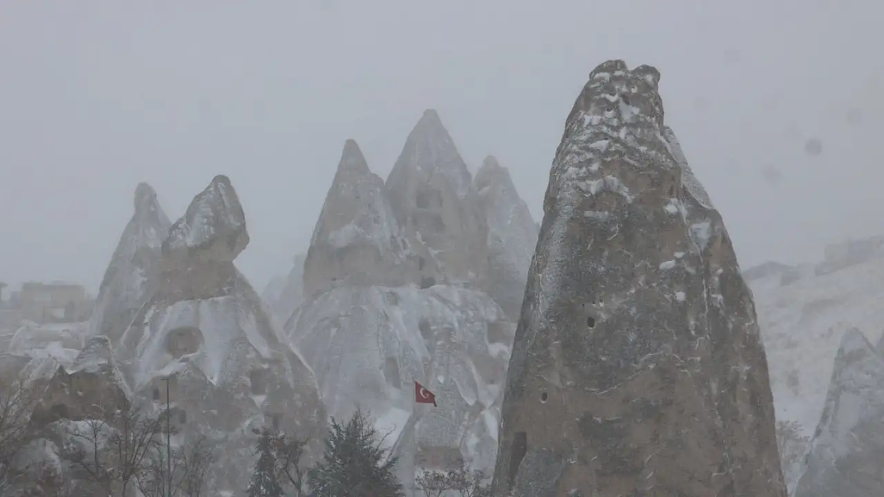 Hava sıcaklıklarının mevsim normallerinin altına düştüğü Kapadokya bölgesinde etkili olan fırtına ve sağanak yerini kar yağışına bıraktı. Bölgedeki peribacaları beyaza büründü. Göreme başta olmak üzere Ürgüp, Zelve ve Uçhisar gibi bölgeleri ziyaret eden turistler, kara ilgi gösterdi.