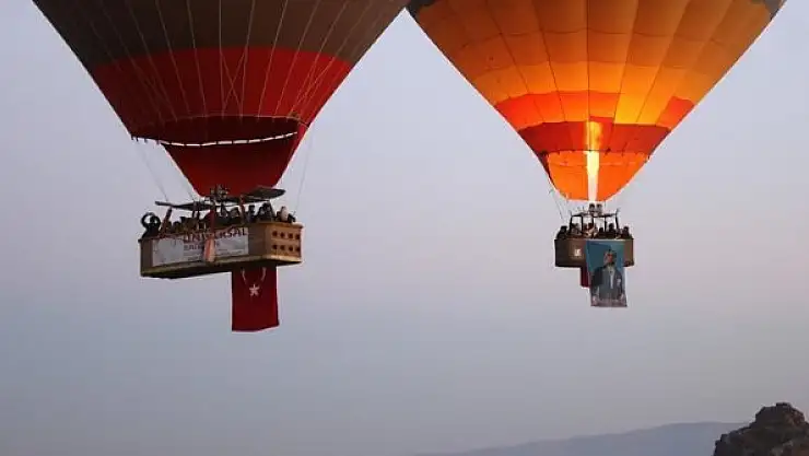 Kapadokya'da balonlar, Türk bayrağı ve Atatürk posterleriyle uçtu