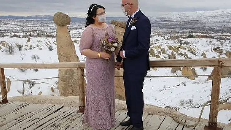 Nevşehir'de yeni koronavirüs (Kovid-19) tedbirleri kapsamında düğün törenleri iptal edilen çift, maskeli önlemle peribacaları arasında albüm çekimi için objektifin karşısına geçti.