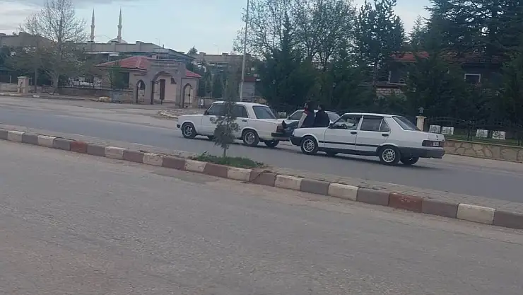 Konya'nın Beyşehir ilçesinde bir otomobilin kaputuna oturan 2 kişinin, yakıtı bittiği ya da arızalandığı düşünülen otomobili ayaklarıyla ittiği anlar cep telefonuyla görüntülendi.