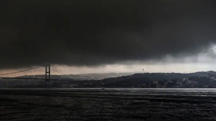 Kar bekleyen İstanbul’da Kız Kulesi’nin ve boğazın üzeri kara bulutlarla kaplandı. Kent merkezinde özellikle sahil şeridi kara bulutların etkisiyle karanlığa büründü. Şehrin bulutlarla kaplı hali ürkütücü manzaralar ortaya çıkardı.
