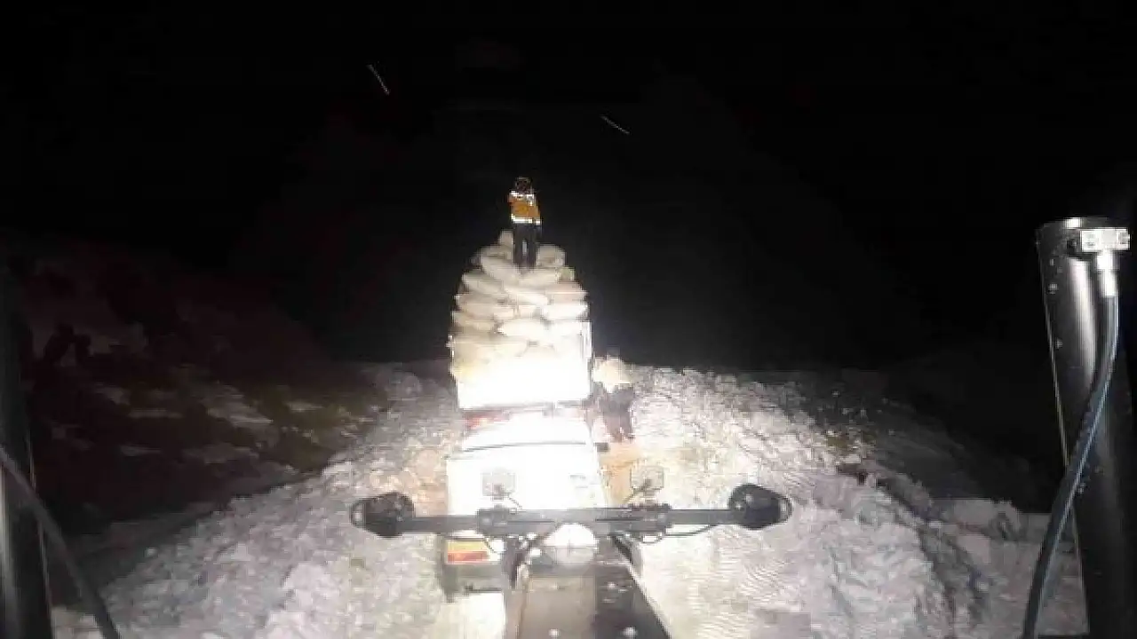 Kar nedeniyle yolda mahsur kalan saman yüklü kamyonet, ekipler tarafından kurtarıldı