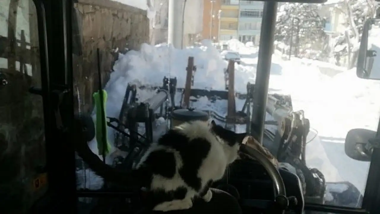"Geçtiğimiz günlerde yoğun kar yağışından dolayı yolları kapanan Karabulak Mahallesi'nde yol açma çalışması yürütürken makinemin kovasının önünde küçük bir siyahlık gördüm. Daha dikkatli bakınca yavru bir kedi olduğunu fark ettim. Hemen iş makinesini durdurarak aşağı indim. Kar kalınlığı bir hayli fazla olduğu için karların içinde hareket edemiyordu. Tüyleri soğuktan donmuştu. Hemen sıcak olan iş makinemin içerisine aldım su ve yemek verdim.Şuan için sağlık durumu çok iyi. İsmini de Ati koyduk. Her gün beraber kar temizleme çalışmasına gidiyoruz. Hafriyat işlerimiz olduğunda da bizlere yine eşlik ediyor. Artık o bizim maskotumuz oldu."