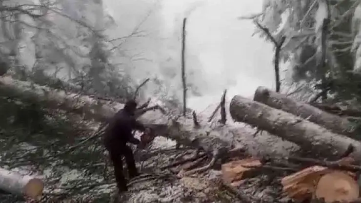 Bolu'da yüksek kesimlerde kar yağışı ve rüzgarın şiddetine dayanamayarak yola devrilen ağaçlar ekipler tarafından kesilerek kaldırıldı.