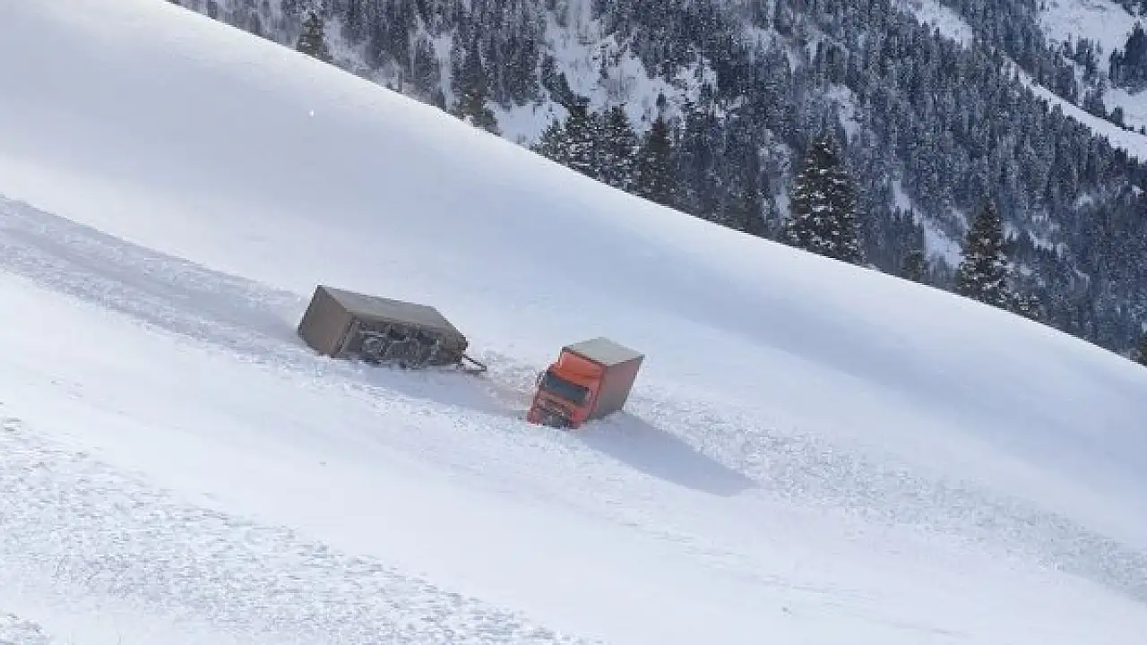 Kar ve tipi nedeniyle Şavşat-Ardahan kara yolları üzerinde bulunan Sahara geçidini kullanan iki tır yoldan çıkarak uçuruma sürüklendi.