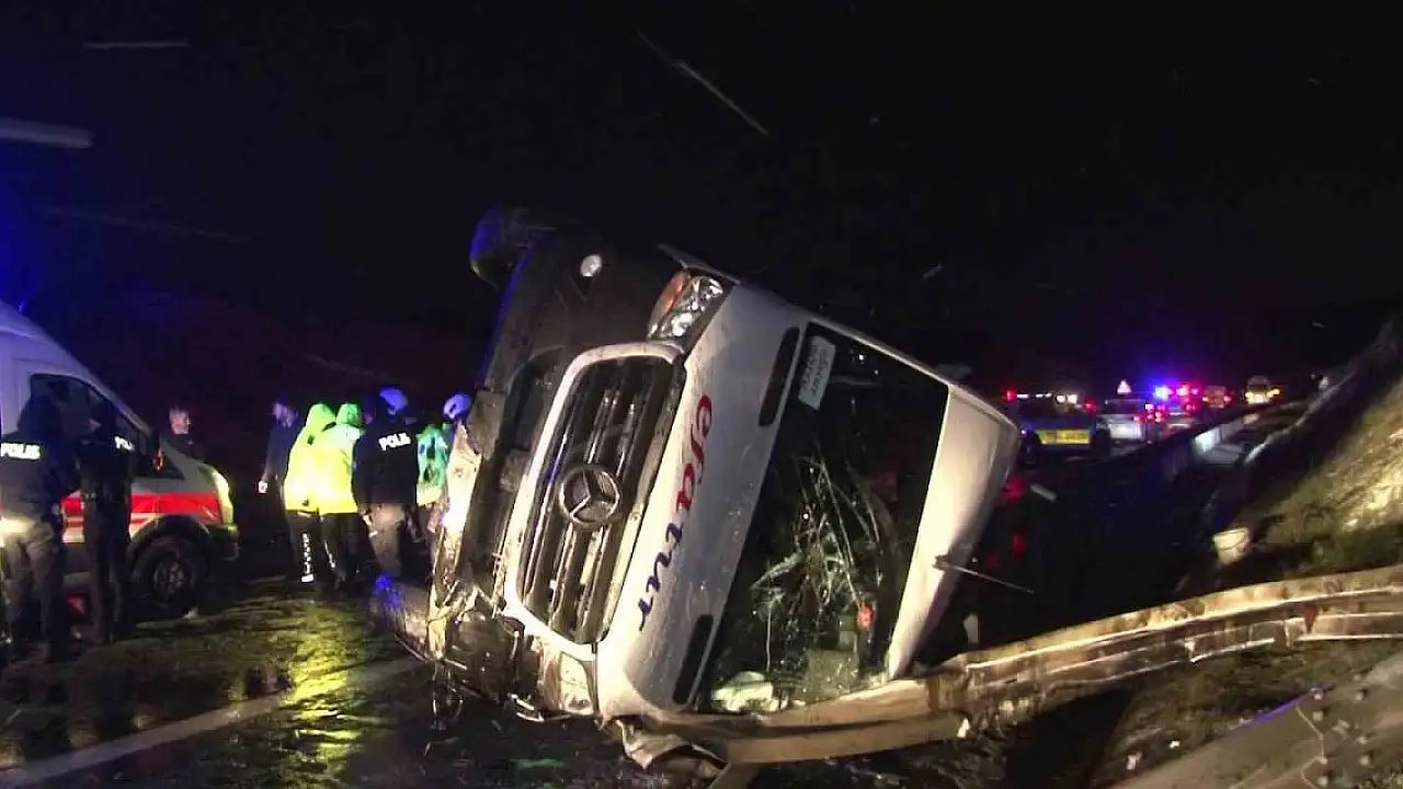 Kuzey Marmara Otoyolu Arnavutköy Boğazköy İstiklal mevkiinde kar yağışı sonrası kayganlaşan yolda servis aracı kayarak yan devrildi. Kazada 11 kişi hafif yaralandı.