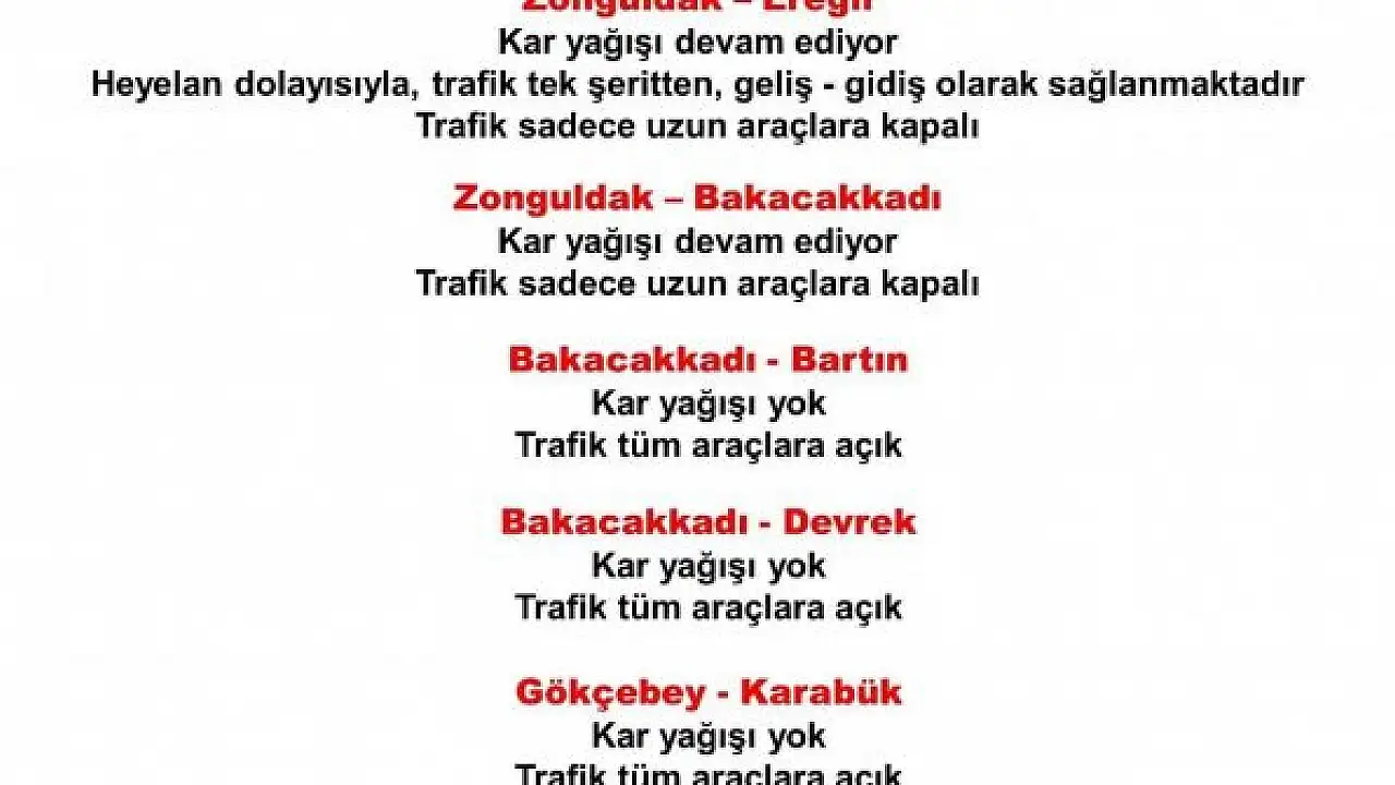 Valilikten yapılan açıklamaya göre; "Zonguldak-Ereğli kar yağışı devam ediyor, heyelan nedeniyle dolayısıyla trafik tek şeritten geliş, gidiş olarak sağlanmaktadır, Zonguldak-Bakacakkadı kar yağışı devam ediyor, trafik uzun araçlara kapalı, Bakacakkadı-kar yağışı yok, trafik tüm araçlara açık, Bakacakkadı-Devrek kar yağışı yok, trafik tüm araçlara açık, Gökçebey-Karabük kar yağışı yok, Trafik tüm araçlara açık, Devrek-Mengen kar yağışı yok, Trafik tüm araçlara açık" ifadelerine yer verildi.