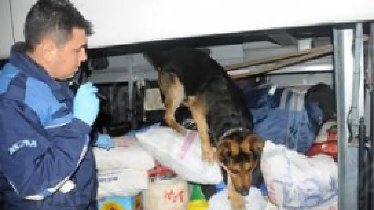 Narkotik köpeği "Ares" otobüsün bagajındaki valizlerden birine tepki verdi. Valizi açan polis, karabiber arasına gizlenmiş 10 kilogram esrar ele geçirdi.