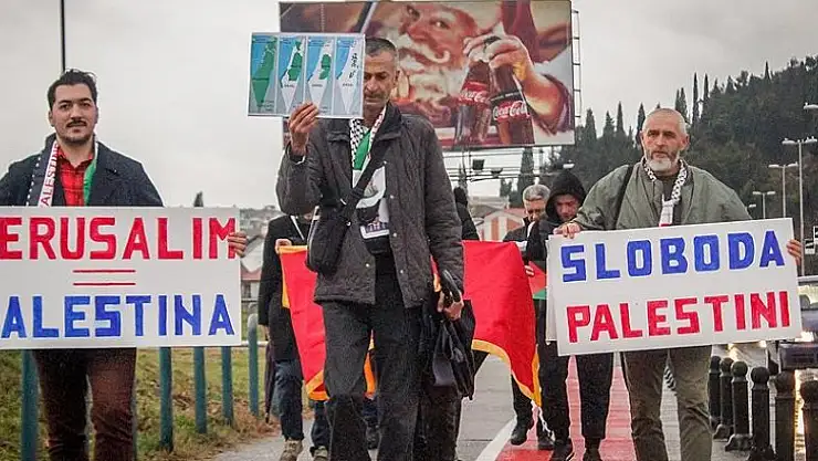 Cuma namazının ardından ABD'nin Podgorica Büyükelçiliği önünde toplanan grup, üzerinde "Kudüs, Filistin'dir", "Filistin'e özgürlük" yazılı dövizler taşıdı.