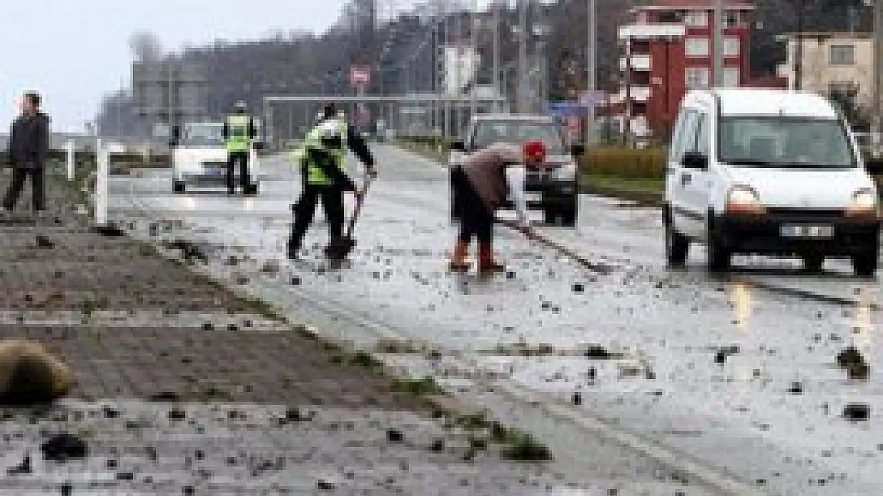 Rize'de etkili olan fırtınanın karayoluna taşıdığı taş ve çakıl yığınları, Karadeniz Sahil Yolu'nda ulaşımda aksamalara neden oldu.