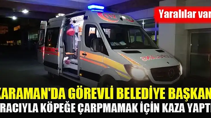 Karaman'da Kazımkarabekir Belediye Başkanı Recep Boyacıoğlu'nun kullandığı otomobil, önüne çıkan köpeğe çarpmamak için direksiyonu kırınca devrildi. Kazada başkan ile araçta bulunan 2 gelini ve 2 torunu yaralandı.