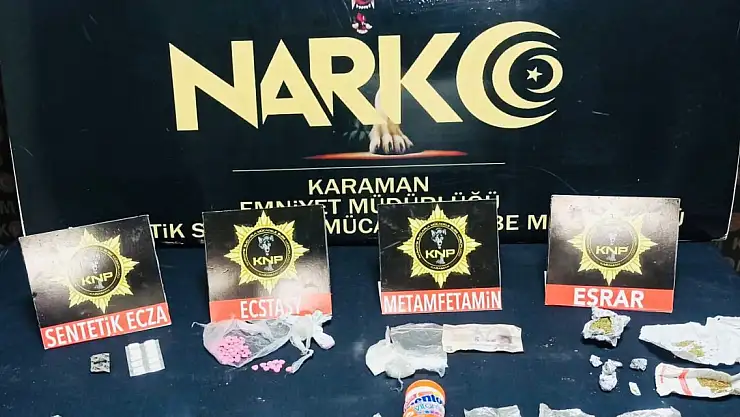 Edinilen bilgiye göre, Karaman İl Emniyet Müdürlüğü Narkotik Suçlarla Mücadele Şube Müdürlüğü ekipleri, uyuşturucuyla mücadele çalışmalarına ara vermeden devam ediyor. Bu çerçevede narkotik ekipleri, şüphe üzerine bir aracı durdurdu. Araçta ve içerisinde bulunan 3 şahsın üzerinde yapılan aramada, 32 gr ağırlığında 5 fişek halinde metamfetamin maddesi, 13,65 gr ağırlığında 6 fişek halinde esrar maddesi, 12 adet sentetik ecza maddesi, 65 adet ecstasy hap, 1 adet tabanca ve 2 adet 9x19 tabanca fişeği ele geçirildi. Araçta bulunan M.Ç., H.K. ve Ç.K. gözaltına alındı. Emniyetteki işlemleri tamamlanan 3 şüpheli, sevk edildikleri mahkemece tutuklandı.