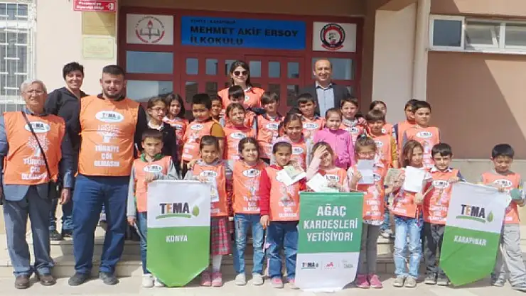 Mehmet Akif Ersoy ilkokulunda 3. Sınıf öğrencilerine yönelik Ağaç Kardeşliği Projesi'ne Mehmet Akif Ersoy ilkokulu Müdürü Umut Kara, TEMA Vakfı Konya İl Temsilciliği yetkililerinden Nazlı Rahşan Mertcan, Emre Bostanoğlu, Karapınar TEMA Vakfı İlçe Gönüllü Sorumlusu Musa Ceyhan öğretmen ve öğrenciler katıldı.
